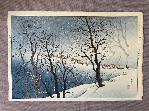 Print Specifics: - seldom seen Takashi image - published by Watanabe Shozaburo - dated 1950 - Watanabe 6mm seal lower left corner in image - from the artist's "Lake Towada" series - first edition printing