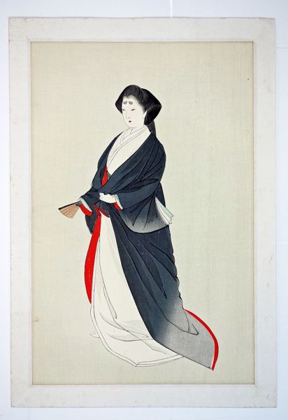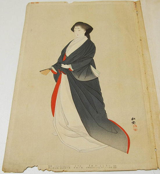 Description "Kinko Fuzoku Hyaku Bijin" ("Modern and Ancient, Customs and Manners, One Hundred Beauties"). A lady with Heian court style makeups. Signature 'Shodo'. Dated 1901. Publisher Wakita Ainosuke?. Medium/Technique Woodblock print. Impression Very good. Colors Very good. Condition Good … Paper toned, slightly soiled. Creased especially around the edges. Foxing and discolorations on the lower area. Fraying and missing parts on the edges. Format Dai-Oban Width Item 10.8 inches = 27.5 cm Height Item 15.9 inches = 40.5 cm |