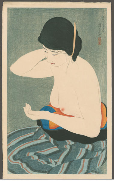 TITLE: Make-up 45/200 SERIES: New 12 Images of Beauties DATE: 1922 SIZE: 17.125 x 10.75 MEDIUM: Woodblock Print PUBLISHER: Watanabe CONDITION: Fine impression, color and condition. INV. #: 02165300 This design is the cover of the exhibition cataloge "Seven Masters, 20th Century Japanese Woodblock Prints from the Wells Collection". |