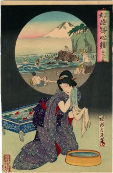 Physical description: Behind the woman, in a circular inset, holiday-makers in sun-hats enjoy themselves on a beach with a view of mount Fuji. |