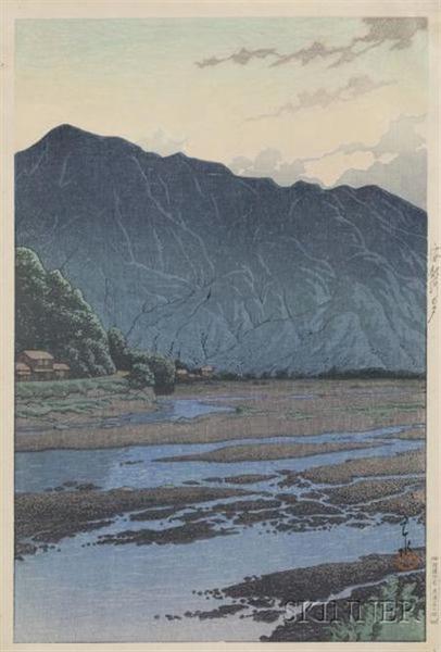 Notes (this edition) These notes were written by the original owner/seller/auctioner of the item and may be inaccurate.: | Hasui: Evening on Abe River, 1932, (fine impression, color, and condition with slight marginal toning), in green folder. |