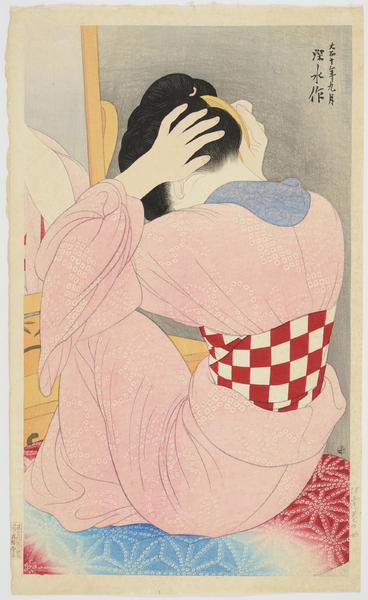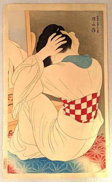 TITLE: Beauty Wearing an Under Sash 9/200 DATE: 1921 SIZE: 17.125 x 10.25 MEDIUM: Woodblock Print PUBLISHER: Watanabe CONDITION: Fine impression, color and condition. |