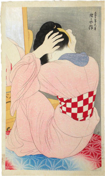 Ito Shinsui ????: Woman Wearing an Under-sash ????? Artist: Ito Shinsui (1898-1972) Title: Woman Wearing an Under-sash ????? (Datemaki no Onna) Date: 1921 Signature: Shinsui. Seal: Artist's red seal. A beauty is seen at her toilette affixing a hair comb in a masterful composition that shows her facing away from us, emphasizing the intimacy of the moment. A modern twist of the scene of a woman at her mirror, the eye here is drawn to the boldly checkered datemaki sash that was worn to secure an under kimono. Perhaps because this accessory was never seen by the public, it accentuates the privacy of this moment. Its tension on her slender waist is emphasized, and we also get a glimpse of her neck as she secures a comb, the neck being considered a highly erotic space by the Japanese. The mirror at left has a mica finish, and the beautiful bokashi effect on the shibori-patterned cushion gives her a sense of floating on air. The pink on her skin is still strongly apparent, indicating that there has been no fading at all. A scarce, pre-earthquake design in perfectly unfaded condition that is considered one of the artist’s best designs. From the first and only edition; sealed , numbered nine out of 200. Unusual elements include the limited edition seal being placed on the front (rather than the verso) and the title of the print being printed in soft grey in the left lower margin. Condition: Excellent impression, color and condition. Dimensions: ôban 43.6 x 26 cm Publisher: Watanabe Shozaburo Literature: Allen Hockley editor, The Women of Shin Hanga: The Judith and Joseph Barker Collection of Japanese Prints, 2013, p. 172, pl 36; Kato Junzo, Kindai Nihon hanga taikei, 1975-76, Vol. 1, pl. 180. Amy Newland and Chris Uhlenbeck, Ukiyo-e to Shin Hanga, 1990, p. 215. Tadasu Watanabe, Ito Shinsui: All the Woodblock Prints, 1992, p. 55, pl. 24. Amy Newland Reigle and Hamanaka Shinji, The Female Image, 2000, p. 53, pl. 31; Amy Newland Reigle, gen. ed., Printed to Perfection, 2004, p. 100, pl. 87.; See Smithsonian National Museum of Asian Art |